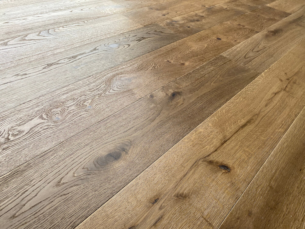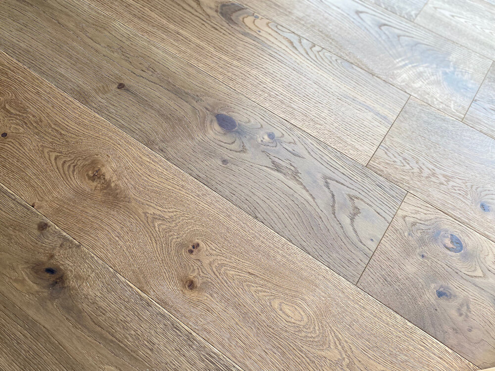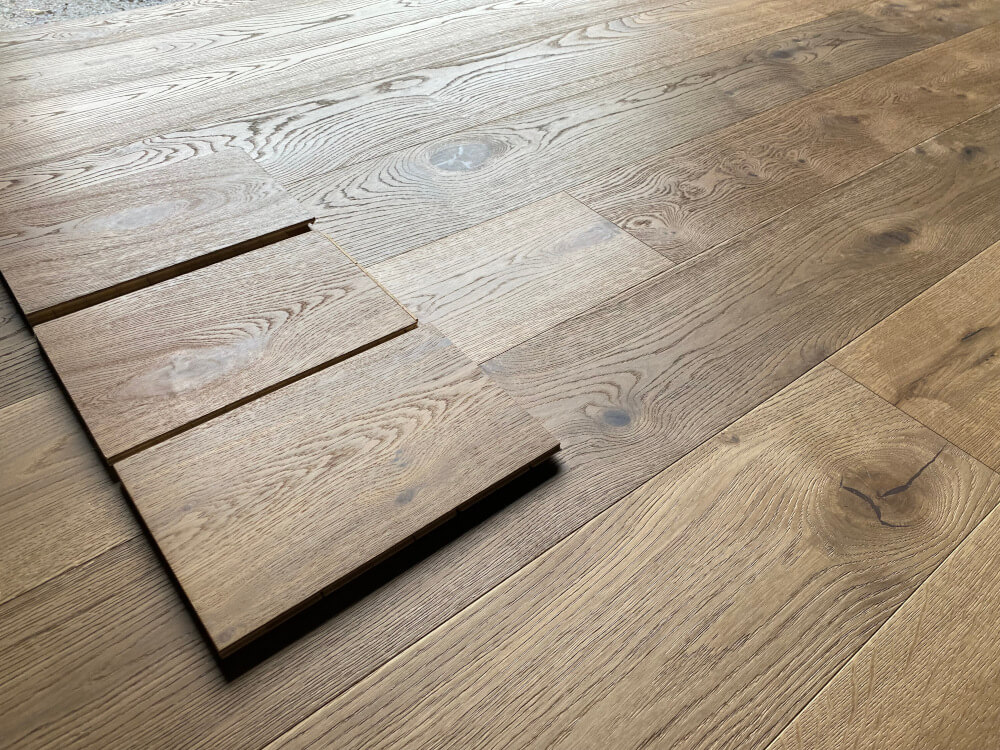 Parkett Eiche „Tradition“ Markant, geräuchert weiß naturgeölt, gebürstet, braun gespachelt