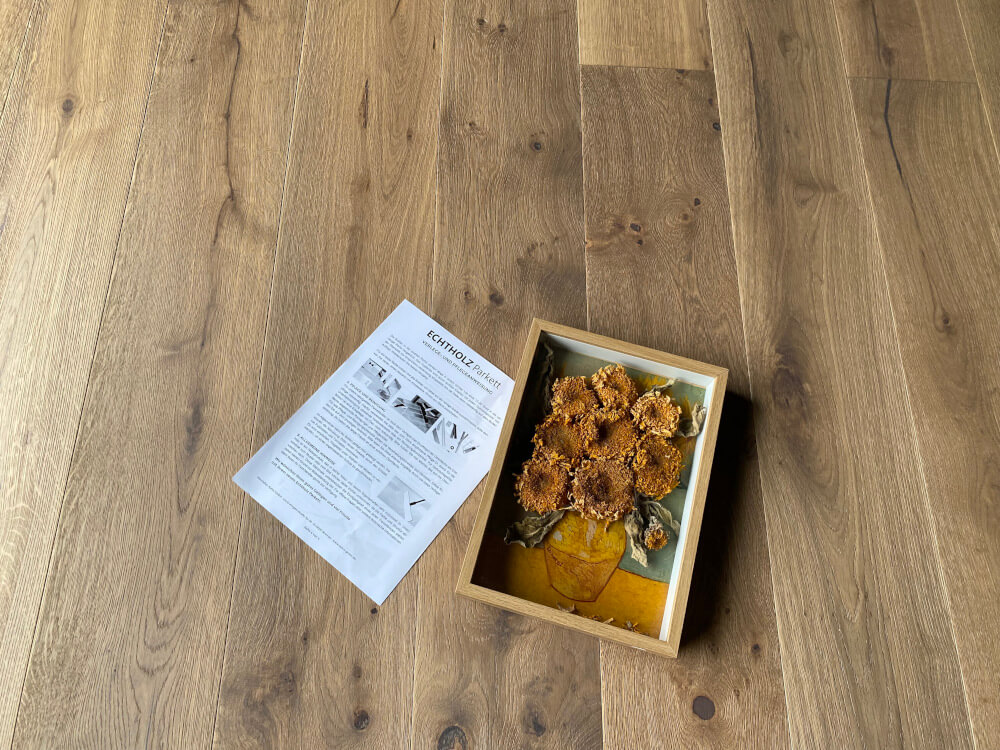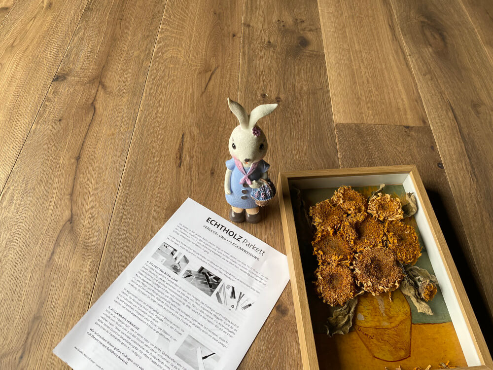 Beschreibung: Parkett Eiche „Tradition“ Markant, geräuchert weiß naturgeölt, gebürstet, braun gespachtelt