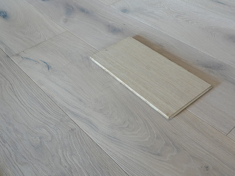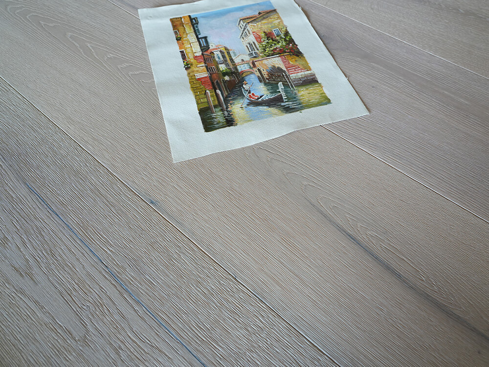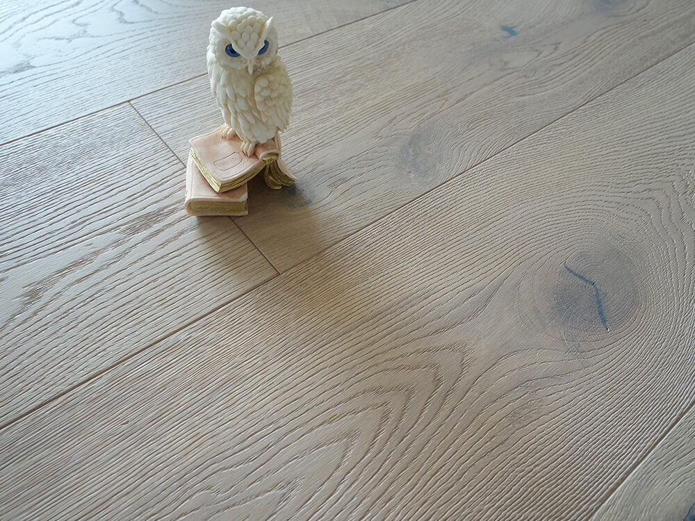 Beschreibung: Parkett Eiche XL „Mammut“ Rustikal, weiß naturgeölt (10%), tief gebürstet, schwarz gespachtelt