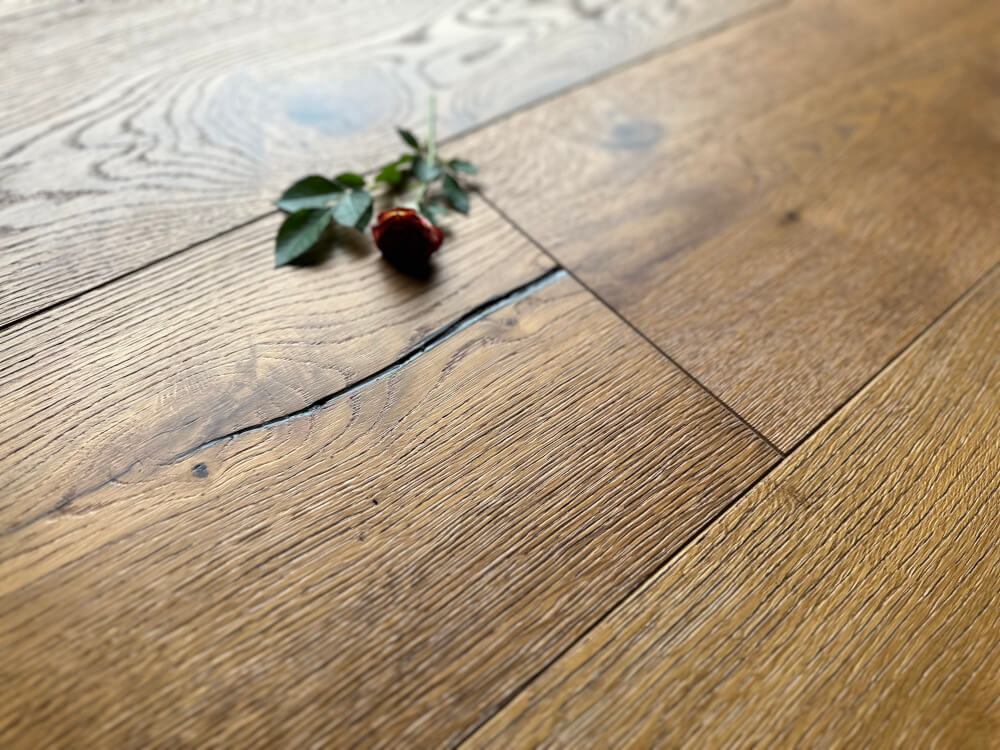 Startseite » Shop » Parkett Eiche XL „Vintage“ Rustikal, geräuchert, naturgeölt, stark gebürstet, schwarz & halb gefüllt